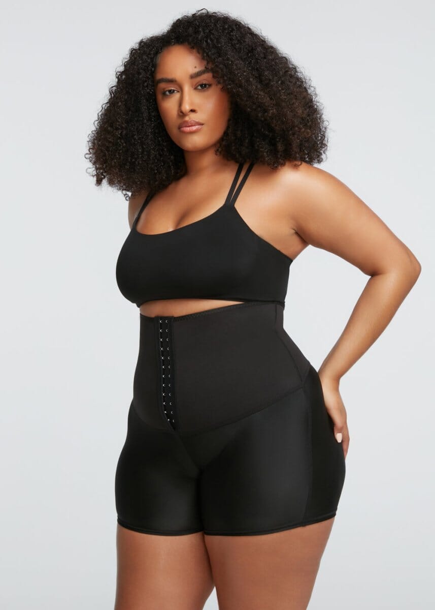 A compressão firme afina a cintura e achata a barriga sem desconforto, enquanto as três fileiras de ganchos ajustáveis garantem um encaixe sob medida, valorizando cada movimento com controle e charme.
